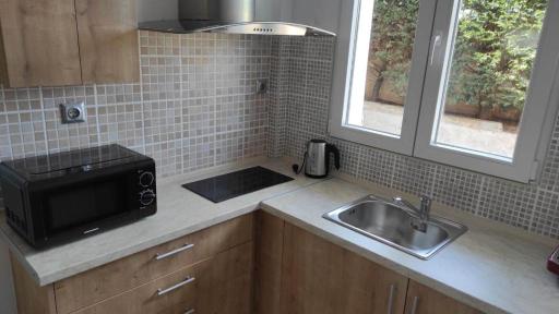 Den luftkonditionerade lägenheten består av ett sovrum, ett vardagsrum, ett fullt utrustat kök med kylskåp och kaffemaskin samt ett badrum med dusch. För att säkerställa en bekväm vistelse finns handdukar och sängkläder tillgängliga. Gästerna kan också njuta av den vackra trädgården och dra nytta av gratis privat parkering.