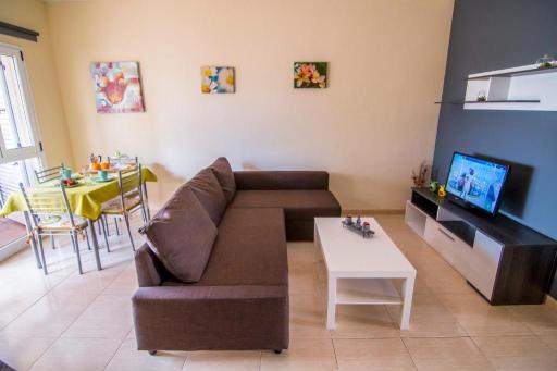 Boendet består av en rymlig lägenhet med två sovrum, ett vardagsrum och ett fullt utrustat kök med kylskåp och kaffemaskin. Det finns även ett badrum utrustat med bidé och hårtork. För att säkerställa en bekväm vistelse, tillhandahålls handdukar och sängkläder. Gästerna kan njuta av den friska luften på uteplatsen eller låta barnen leka på den närliggande lekplatsen.